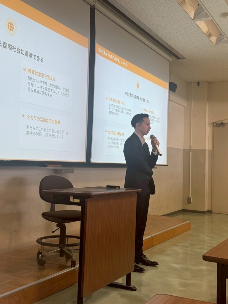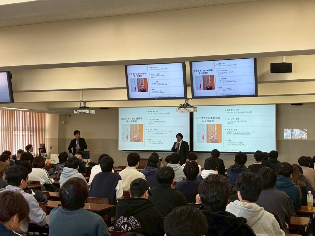 11月24日、国士館大学にて講義を開催いたしました。講義では、元在ダナン日本国総領事の矢ヶ部氏をお招きし、ベトナムの経済成長や日本との関係について、現地で直接ご覧になってきた経験を学生たちへお話していただきました。矢ヶ部氏は総領事をご退任された後も弊社の顧問としてベトナムには携わっておられます。ベトナムと深い関わりを持つ弊社だからこそ、学生の皆さんにリアルをお伝えできたのではないかと考えております。今回の講義が、学生たちの学びに少しでもつながれば幸いです。